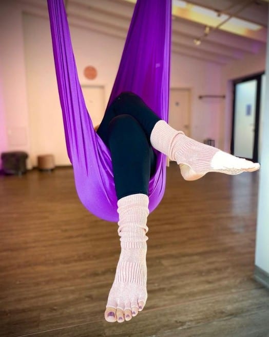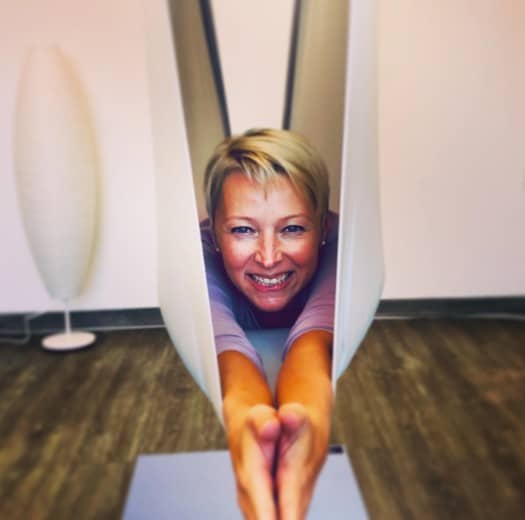 Eine besondere Form des Yoga entdeckte ich im Urlaub – Aerial Yoga. Neugierig wie ich war, probierte ich das natürlich gleich aus. Und wusste sofort, dass das Tuch die perfekte Ergänzung für meine Praxis war. Das Gefühl zu fliegen, der Perspektivwechsel kopfüber und diese unglaubliche Länge im Rücken haben mich von der ersten Stunde an fasziniert.